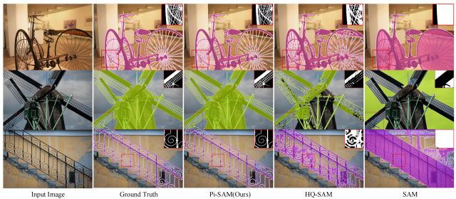 图1:提出的Pi-SAM与SAM和HQ-SAM的定性比较。在这些具有挑战性的高分辨率图像样本中,我们的Pi-SAM展示了捕捉极细微细节和感知复杂拓扑结构的卓越能力,实现了高精度的分割结果。