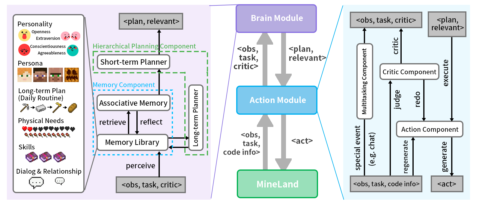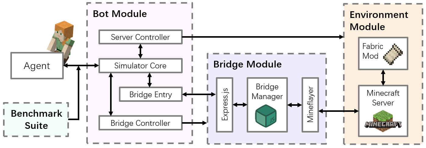 我们搭建了一个Simulator作为AgentMinecraft游戏之间的桥梁,支持128+Agent加入,引入了多模态的数据,包括视觉、听觉、触觉等。以CodeAction Space,提供Low-levelHigh-level两套Action