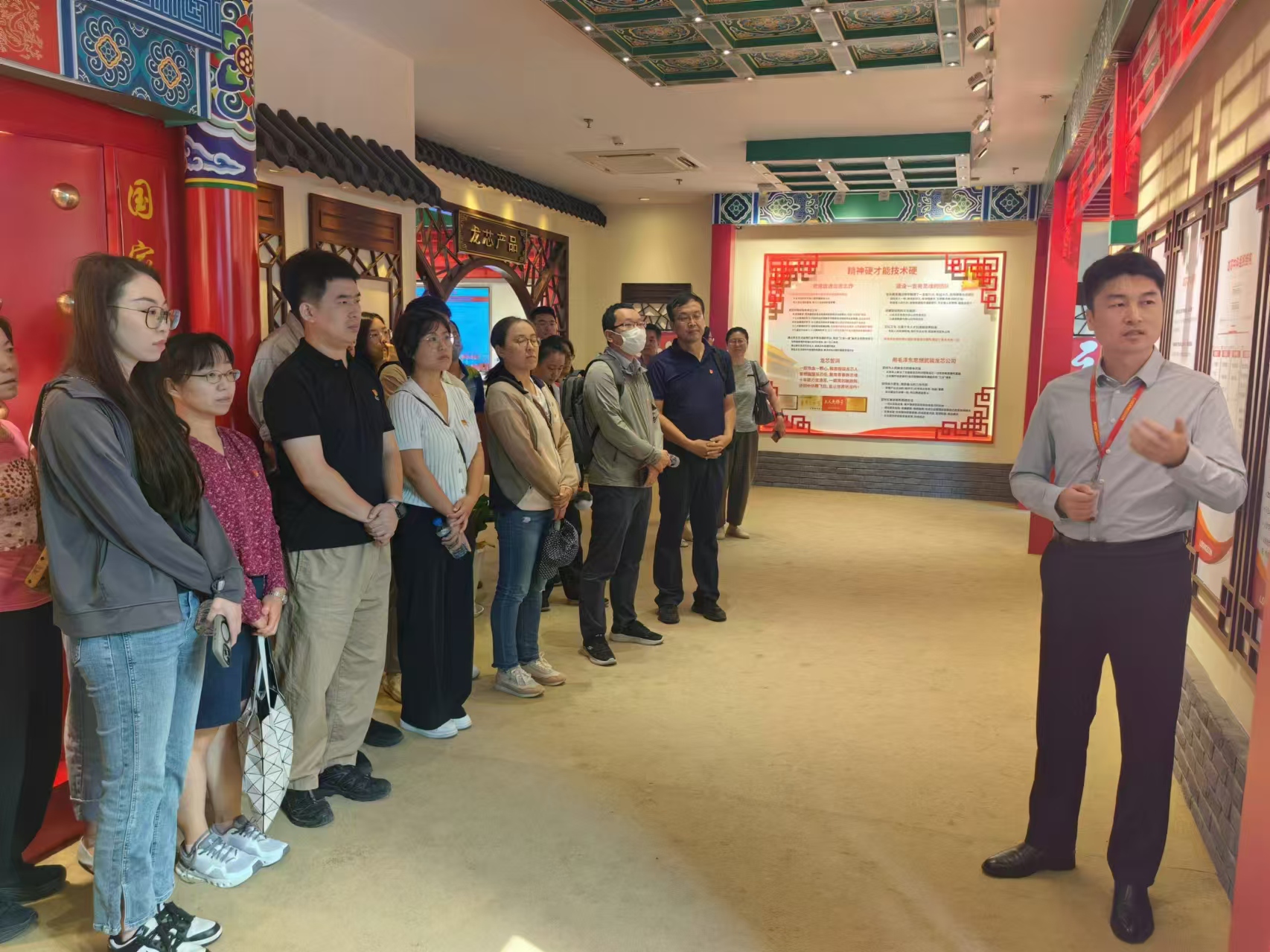 学院党委书记贾卓生、副院长(主持工作)李浥东带队,学院70余位教职工党员首先分组参观了龙芯中科总部展厅,在副总裁张戈的解说带领下,详细了解了龙芯中科的发展历程、核心技术和产品应用情况。特别是最新一代国产CPU的研发进展及其对于保障国家信息安全所起到的关键作用,给党员留下了深刻印象,纷纷表示要把这部分内容融入到课程思政中,增强学生对国内自主可控技术的理解和认识,同时激发学生爱国情怀和技术报国的热情。随后,党员们观看了龙芯中科企业宣传片,片中不仅展示了公司在科研创新方面取得的重大突破,同时也反映了龙芯党总支部带领全体员工积极投身于我国信息技术自主创新事业中的奋斗历程,进一步激发了党员的责任感和使命感。