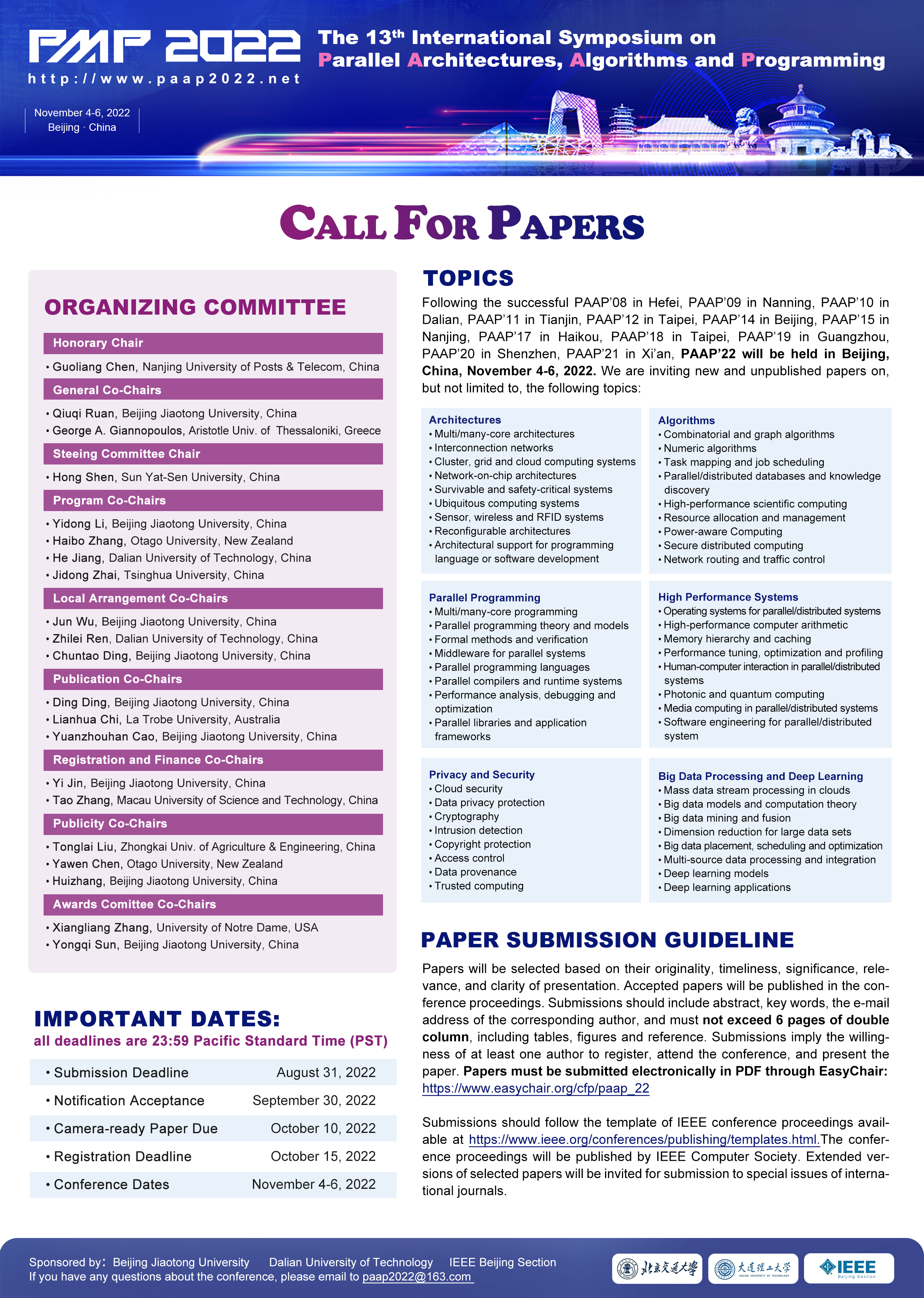 2022年第13届并行结构、算法与程序设计国际会议(PAAP 2022)将于2022年11月在中国北京召开,此次大会由性爱直播 计算机与信息技术学院主办。大会致力于为学术界和工业界的科学家和工程师提供一个论坛,展示他们在并行结构、算法与程序设计各方面的研究成果和开发活动。欢迎各位老师和同学踊跃投稿、参会,共同探讨、交流相关领域的最新研究进展及面临的机遇与挑战。