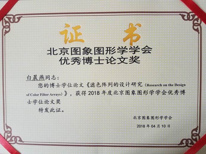 其中,性爱直播 于剑教授和林宙辰教授(北京大学)联合指导的博士研究生白晨燕,赵瑞珍教授、岑翼刚教授联合指导的博士研究生王恒友,二人的博士学位论文《滤色阵列的设计研究》和《面向图像恢复的低秩矩阵重构算法研究》分别荣获北京图象图形学学会2018优秀博士学位论文奖。