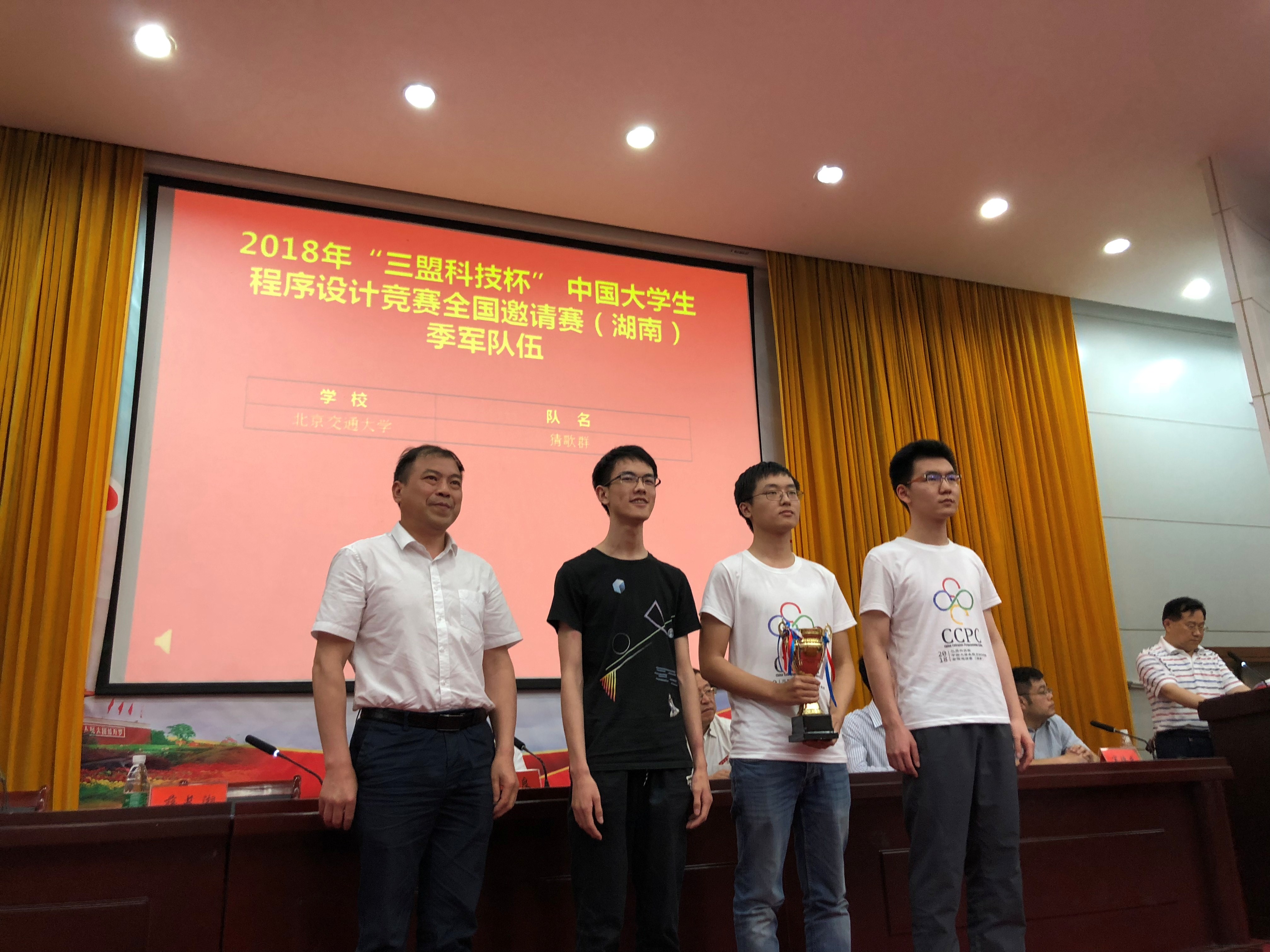 2018年第4届CCPC(中国大学生程序设计竞赛)全国邀请赛湘潭赛站于2018年5月12日-13日在湘潭大学举行。性爱直播 派出参赛队伍——“猜歌群”队(何卫锋、郑黎明、王天舒)赴现场参赛。来自全国60所高校的177支队伍展开激烈角逐。在本赛站的开幕式上,性爱直播 ACM教练许华婷应邀代表参赛教练发言。湘潭市科学技术协会党组书记、主席涂敬阳,湘潭市人民政府秘书长刘定良,湘潭市科学技术协会副主席蒋长湘,湘潭市计算机学会理事长刘任任,湘潭大学副校长刘建平,湘潭大学科协秘书长许斌等出席闭幕式。