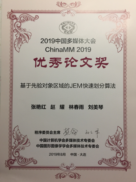 2019年8月25日至28日,由中国计算机学会(CCF)主办,CCF多媒体技术专业委员会、中国图象图形学学会(CSIG)多媒体专业委员会和新一代人工智能产业技术创新战略联盟共同协办的中国多媒体大会(ChinaMM2019),在大连成功举办。计算机与信息技术学院信息科学研究所硕士生张艳红的论文《基于先验对象区域的JEM快速划分算法》(由赵耀教授、林春雨副教授指导)获得优秀论文奖。