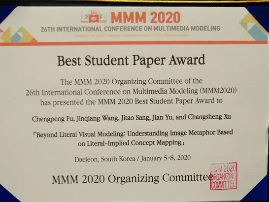 2020年1月5日至1月8日,在韩国大田召开了第26届国际多媒体建模大会(26th International Conference on Multimedia Modeling, MMM2020)。学院机器学习与认知计算团队完成的论文Beyond Literal Visual Modeling: Understanding Image Metaphor Based on Literal-Implied Concept Mapping通过专委会评审推荐、现场答辩、专委会评议,获得了本次会议唯一最佳学生论文奖(Best Student Paper Award)。