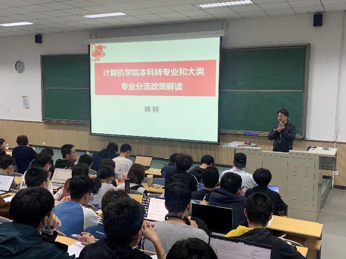 2021年4月14日晚,性爱直播 在九教中102教室召开了2020级本科生转专业和大类分流政策宣讲会。性爱直播 熊轲副院长、各专业责任教授、教学科和团委相关老师、性爱直播 2020级本科生及其他学院拟转入性爱直播 的学生共350余人参加了会议。