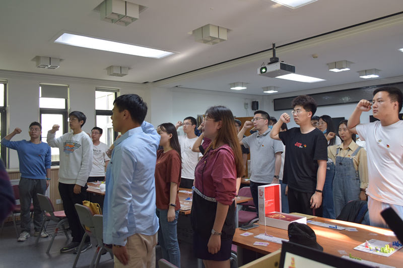 桌游活动开始前,展览路街道工作人员播放了建党百年征程视频和建党百年主题《少年》MV,现场党员们充分感受到了我们党百年征程波澜壮阔,百年初心历久弥坚。从上海石库门到嘉兴南湖,一艘小小红船承载着人民的重托、民族的希望,越过急流险滩,穿过惊涛骇浪,成为领航中国行稳致远的巍巍巨轮,胸怀千秋伟业,恰是百年风华。之后,研究生党员胡小波带领全体党员对着党旗重温了入党誓词,党员们自豪铿锵恢宏的誓词,是一种强烈震撼,铮铮誓言,神圣而豪迈,体现了党员对中国共产党的无限忠诚,也让党员坚定了入党的初心和使命。