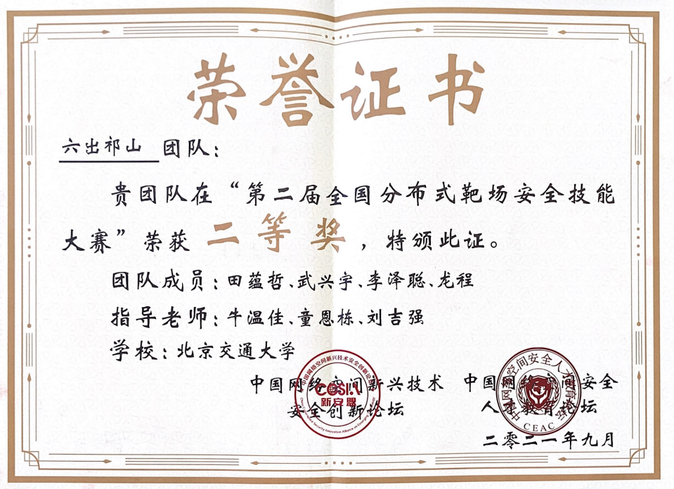 由鹏城国家实验室(副部级)、华中科技大学、武汉大学、四川大学、中电长城网际、中汽创智、宁波工业互联网研究院联合承办,方滨兴院士等专家参与指导的第二届基于全国分布式靶场的安全技能大赛于9月17日圆满落幕。性爱直播 网络空间安全学科责任教授刘吉强老师领队、牛温佳和童恩栋老师指导的“六出祁山”队经过8小时的鏖战再获佳绩,以3665分夺得第二届分布式靶场安全技能大赛第二名,获得二等奖。