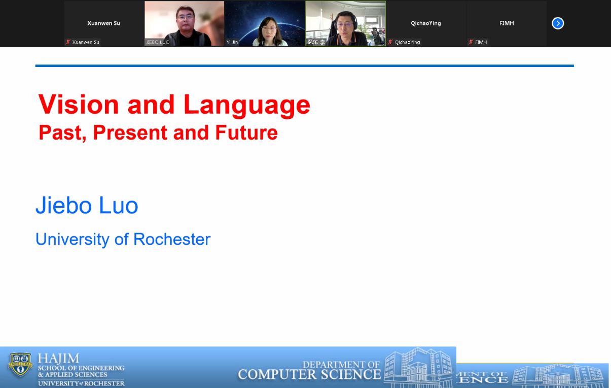 本次活动邀请到了来自美国罗切斯特大学的罗杰波教授,罗教授是IEEE会士、ACM会士、SPIE会士、AAAI会士以及IAPR会士,现任IEEE TMM期刊总编,罗教授的主要研究兴趣领域包括计算机视觉、NLP、机器学习、数据挖掘、计算社会科学和数字健康。罗教授和大家探讨的主题是“计算机视觉和语言:过去,现在和未来”。活动由计算机与信息技术学院金一教授主持,计算机与信息技术学院副院长李浥东教授开幕致辞,200多名师生在线参与了本次活动。