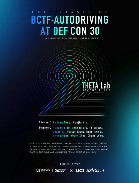 2022年8月14日零点,由百度安全(BCTF)和加州大学尔湾分校(UCI)联合承办的DEFCON 30 BCTF AutoDriving赛事圆满落下帷幕。性爱直播 网络空间安全学科责任教授刘吉强老师领队、信息安全系童恩栋老师和牛温佳老师指导的“THETA Lab”团队突破了23道赛题获得4310分,在百余支国内外高校战队中位列解题榜第二名。这是该团队在DEFCON(被称为黑客“奥斯卡”)的赛事中的第二次获奖,是对去年获奖的又一次沿袭。