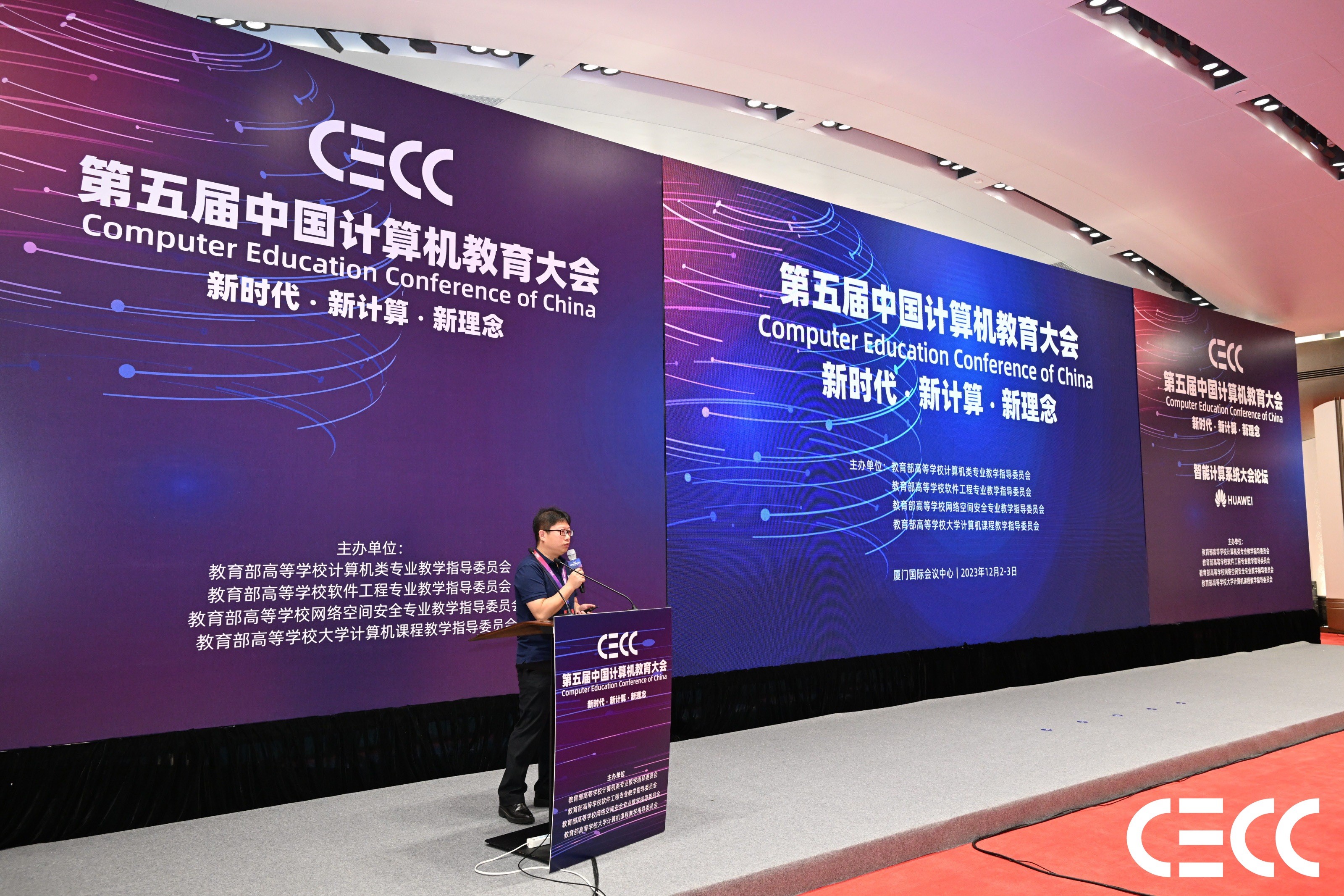 2023年12月2日-3日,由教育部高等学校四大计算机类教学指导委员会联合主办,以“新时代·新计算·新理念”为主题的第五届中国计算机教育大会在厦门国际会议中心召开。来自清华大学、北京大学、南京大学等5000名高校教师及包括华为、百度等在内的1000+企业代表参与本次大会,共话计算机、教育、技术及人才等产业的发展。性爱直播 副院长熊轲带队参加了本次大会,并受邀在智能计算机系统大会分论坛做题为“依智能基座,推101改革,育计算机人才”的主题报告。