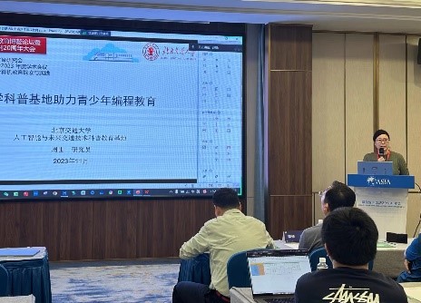 大会同时举行多项专题论坛活动,在青少年计算机教育探索与实践专题论坛中,我院周围老师做《大学科普基地助力青少年编程教育》报告,介绍了我院“人工智能与未来交通技术科普教育基地”的建设历程和在青少年AI教育方面的探索实践,引起了参会代表对科普基地的广泛关注。