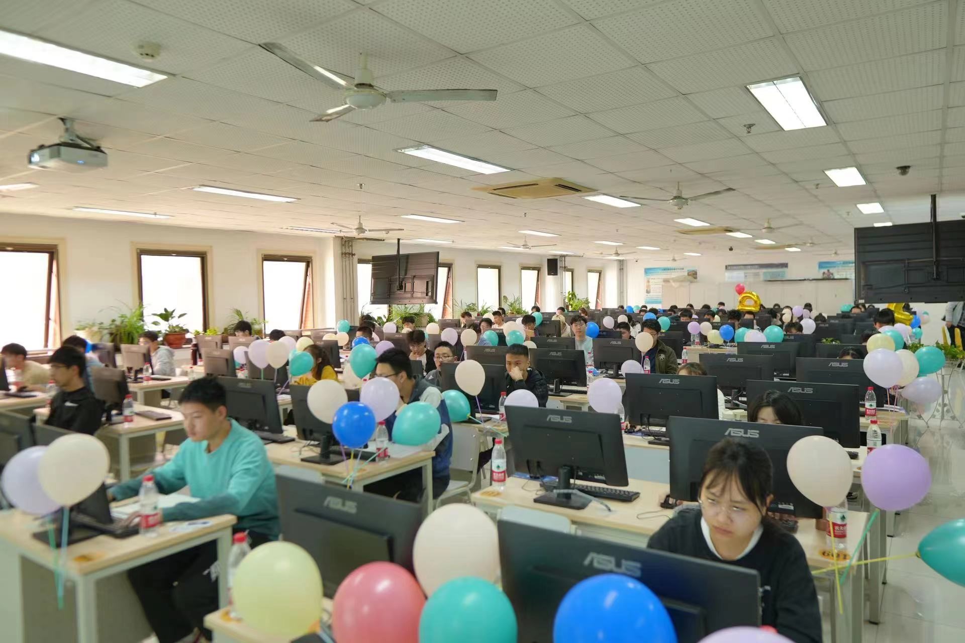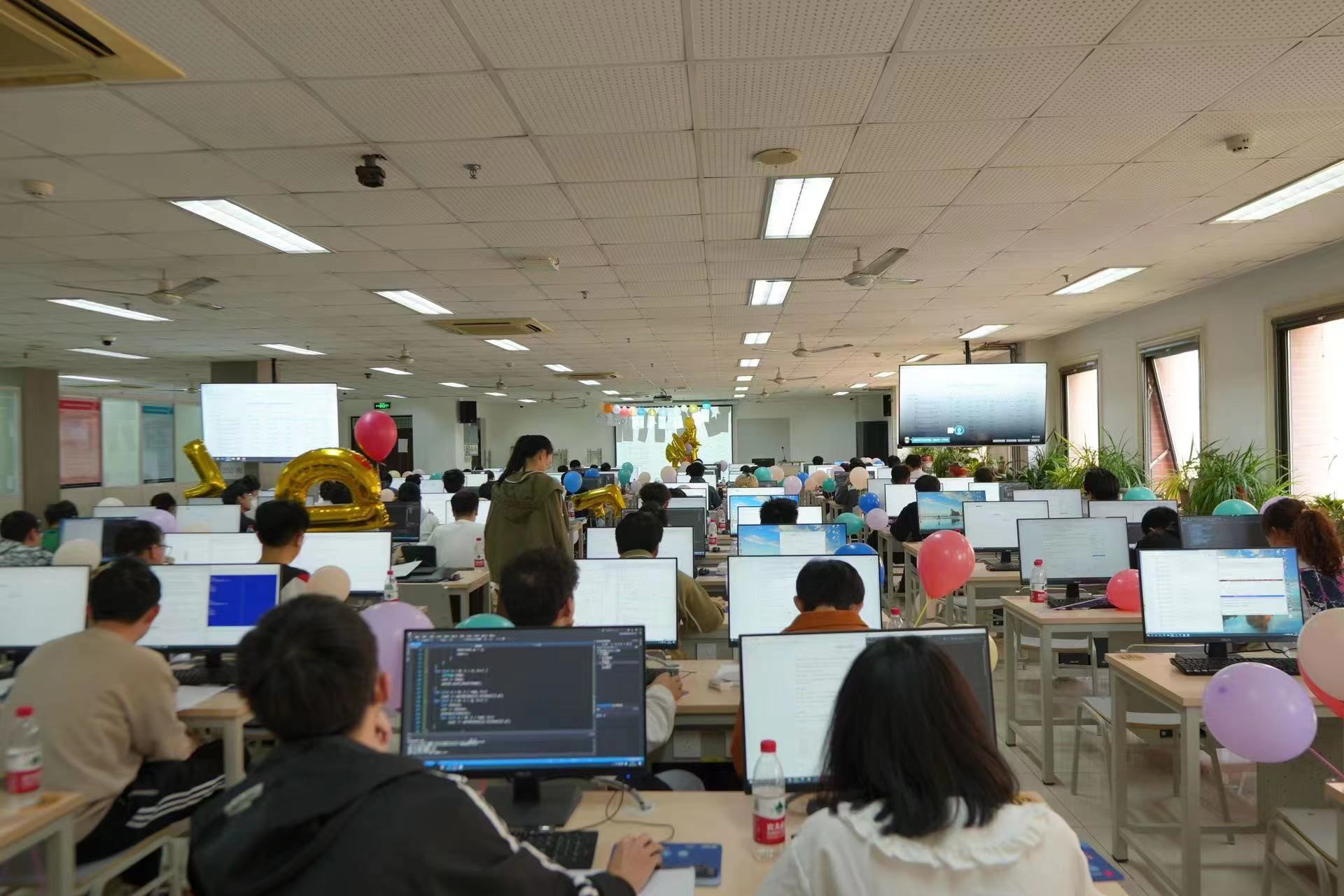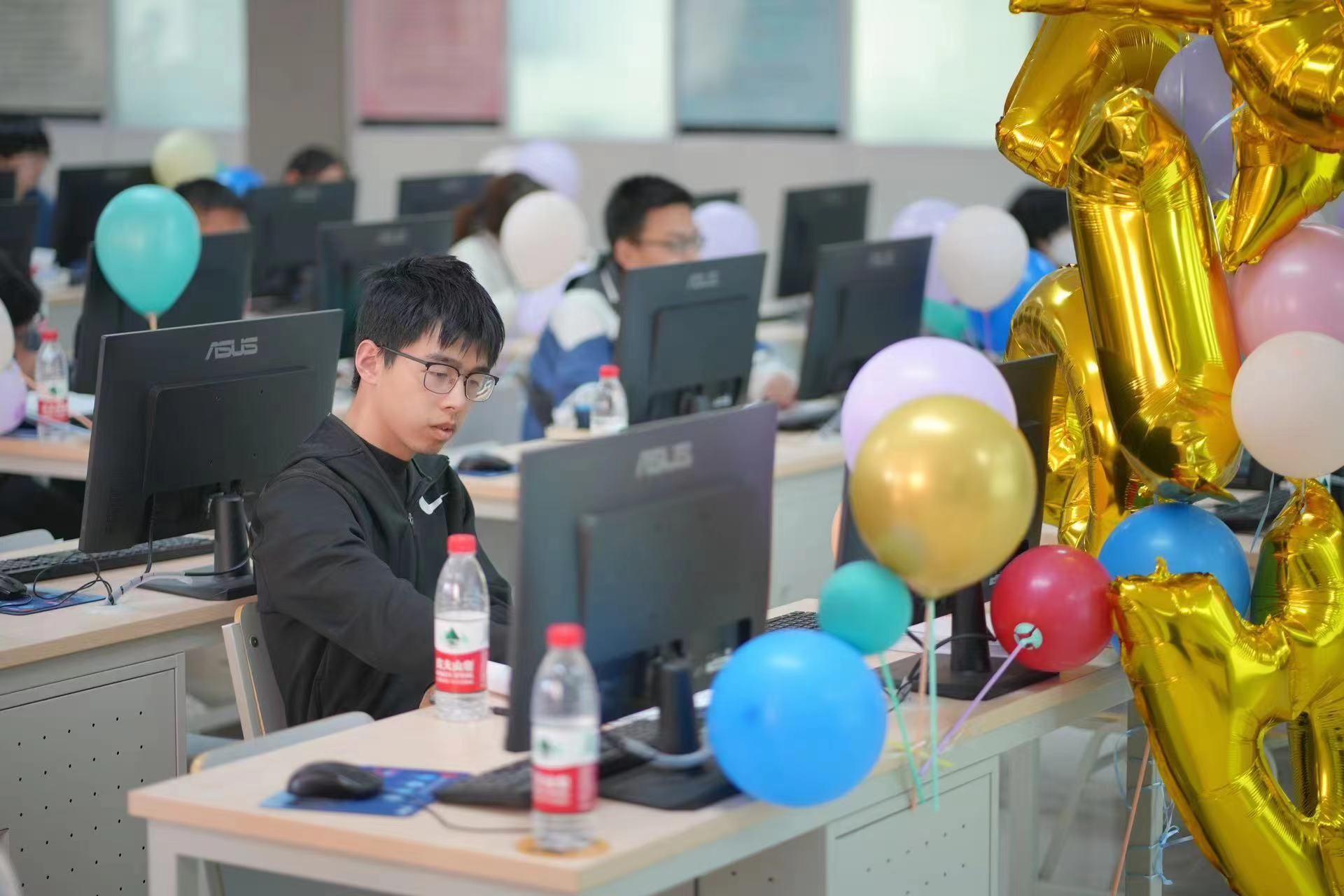 此次大学生程序设计竞赛共有来自包括威海校区在内的全校13个学院的393名本科同学报名参加,创历史新高。根据赛程安排,本次竞赛于2023.4.7-10日启用了网络预赛,经过代码查重等环节,全校共有212名同学获得现场赛参赛资格(含威海校区20名同学)。本次赛事活动还邀请了北京师范大学、中国传媒大学、北京化工大学等部分兄弟院校以及衡水中学的同学远程参赛,切磋技艺,共同交流。比赛延续了“一校两区”的办赛模式,同一份赛题、同一个排行榜单、不同年级的同学同台竞技,在保障比赛公平、公正和安全的前提下,比赛在主校区和威海校区的机房同时开展。不同现场赛点的同学都只能在规定的机房参赛,访问同一个比赛服务器,查看同一个排行榜单,除此之外不能访问任何其他网络资源;参赛选手提交的所有解题代码均由机器依据数据进行自动评测,排除了人为因素,保障了赛事的公平公正。
